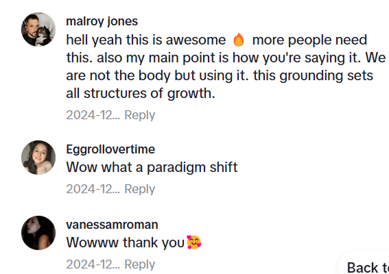 More people need this. Also my main point is how you're saying it. We are not the body but using it. This grounding sets all structures of growth.